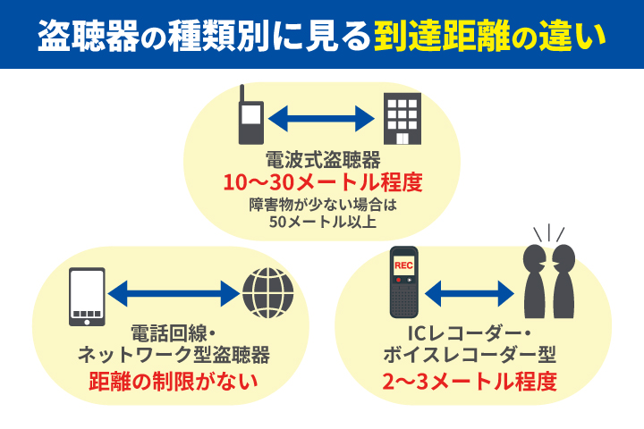 このタイプは電波を使わないため、発見されにくいというメリットがある一方、リアルタイムでの盗聴はできません。また、距離という概念も「電波の届く範囲」ではなく「マイクが拾える音の範囲」になります。高性能なマイクを使えば、数メートル離れた会話でも拾えることがありますが、通常のレコーダーであれば2〜3メートル程度が限度でしょう。